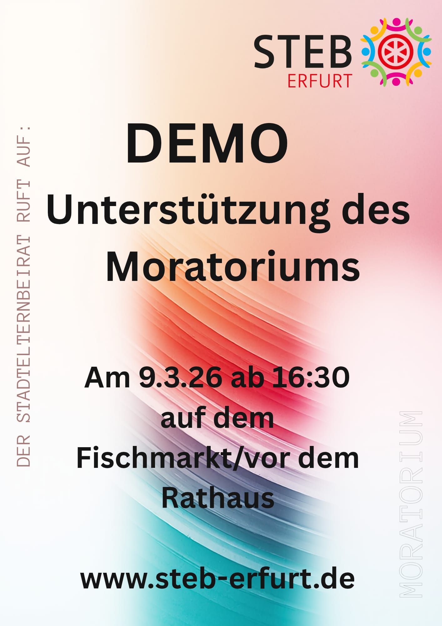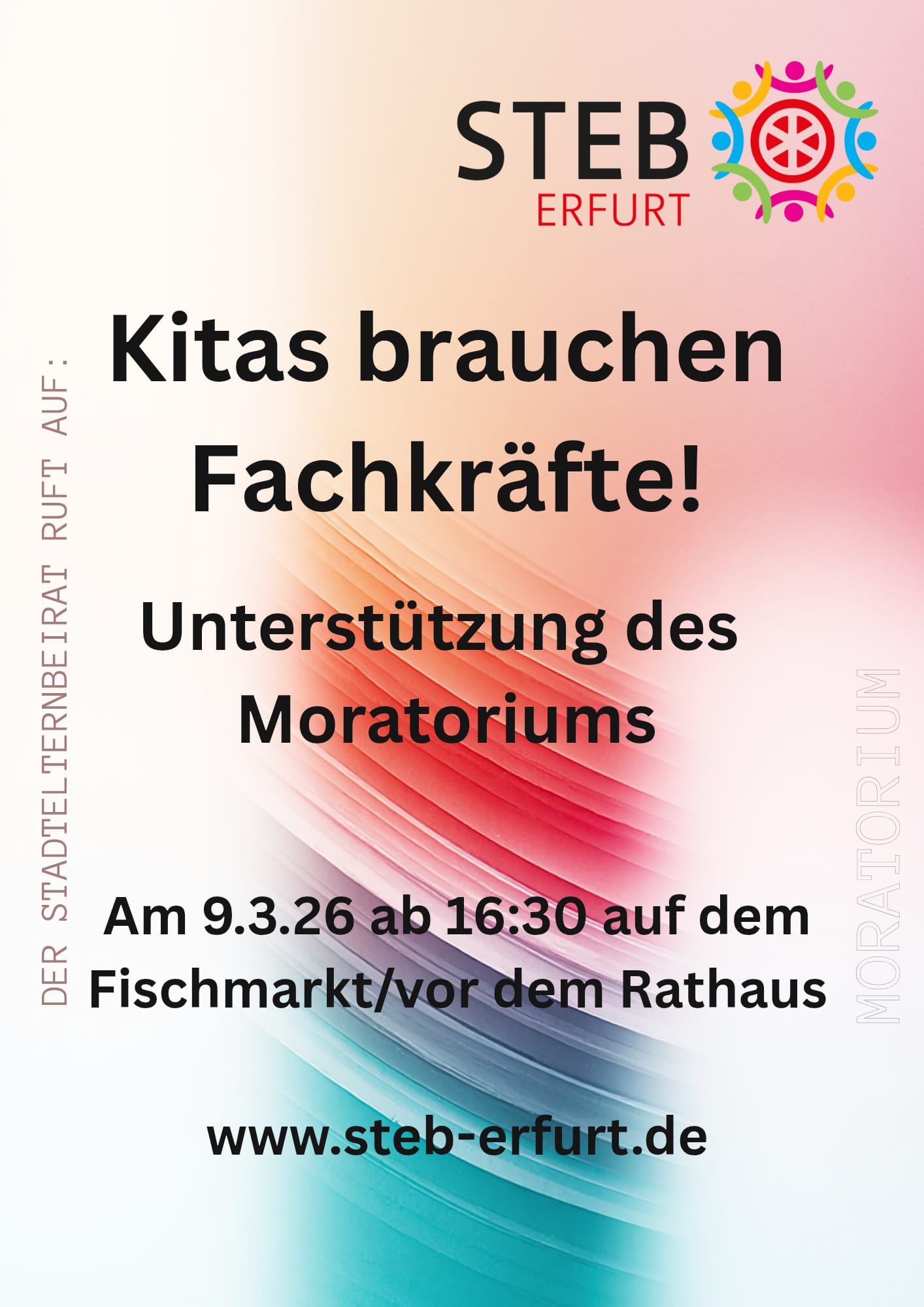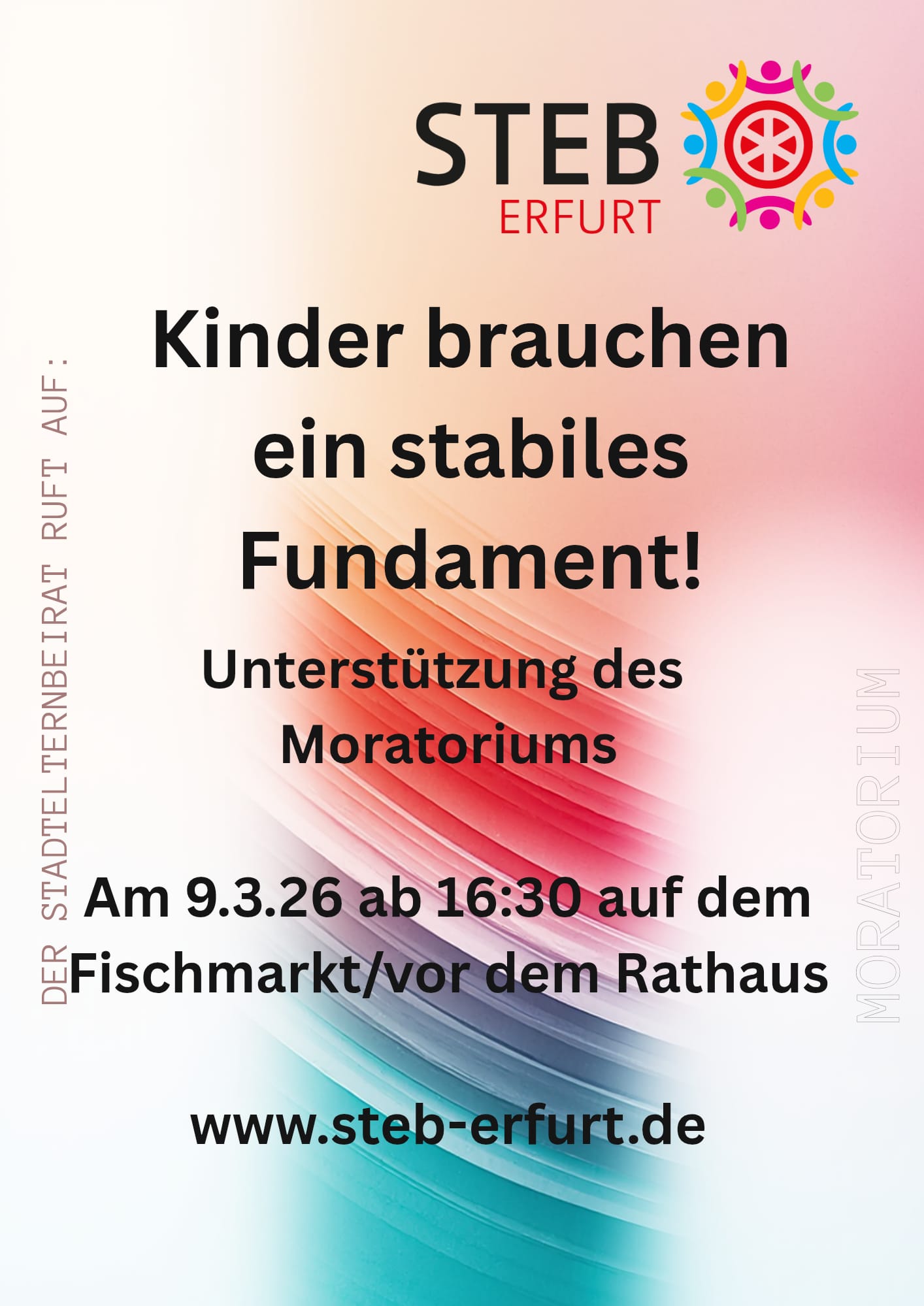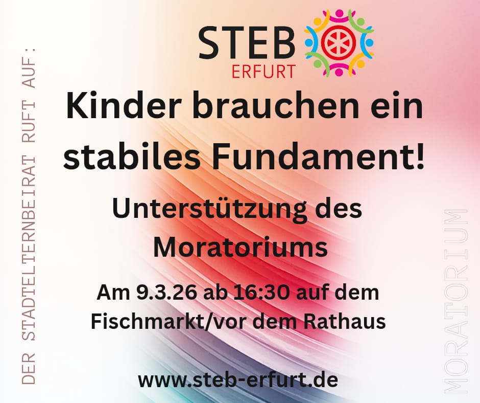 Der Stadtelternbeirat Erfurt (STEB) ruft alle Eltern, Familien und Unterstützer:innen dazu auf, am 09. März 2026 gemeinsam auf die Straße zu gehen. Wir wollen ein starkes, unüberhörbares Zeichen setzen: Erfurt braucht das Moratorium – jetzt.