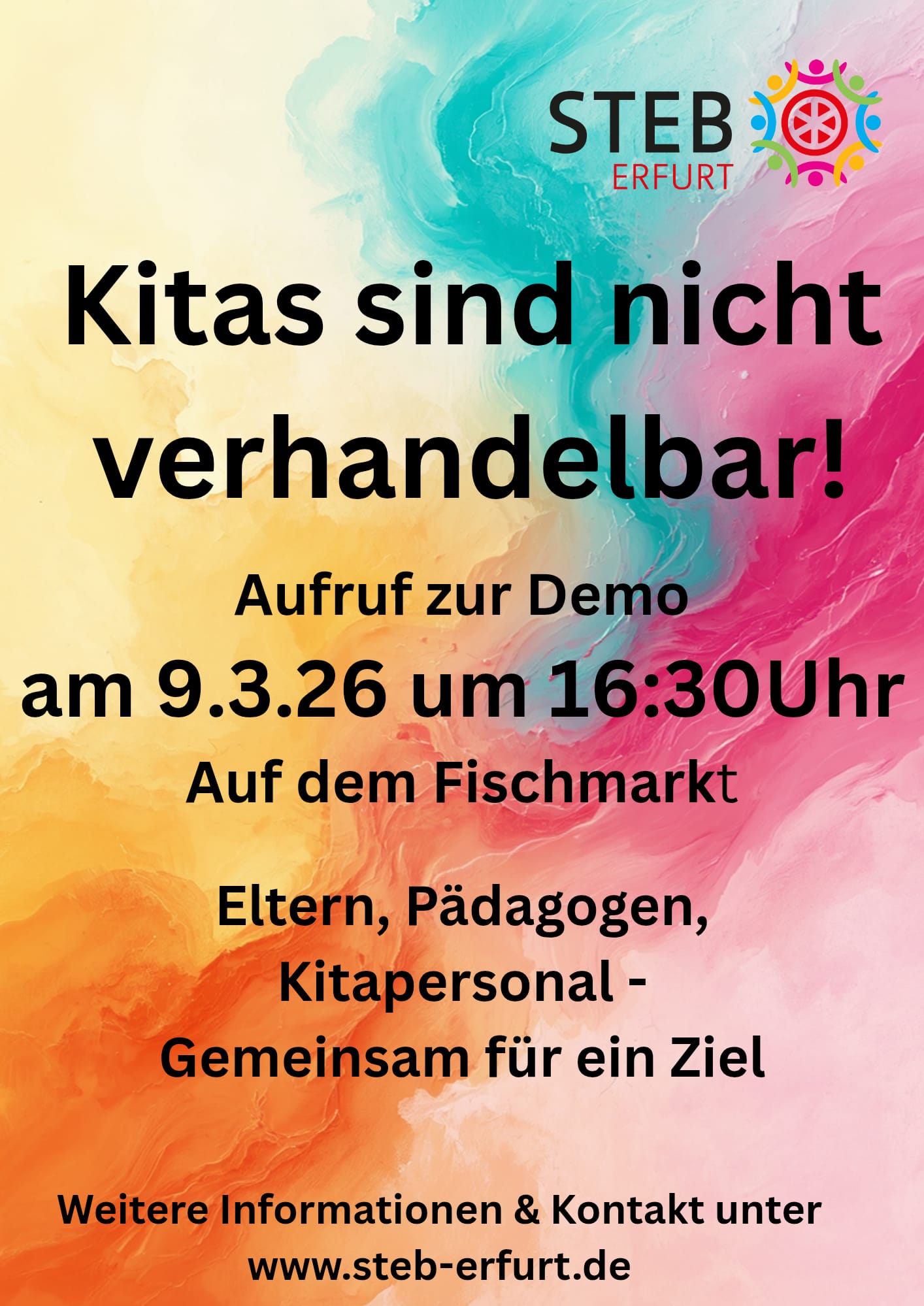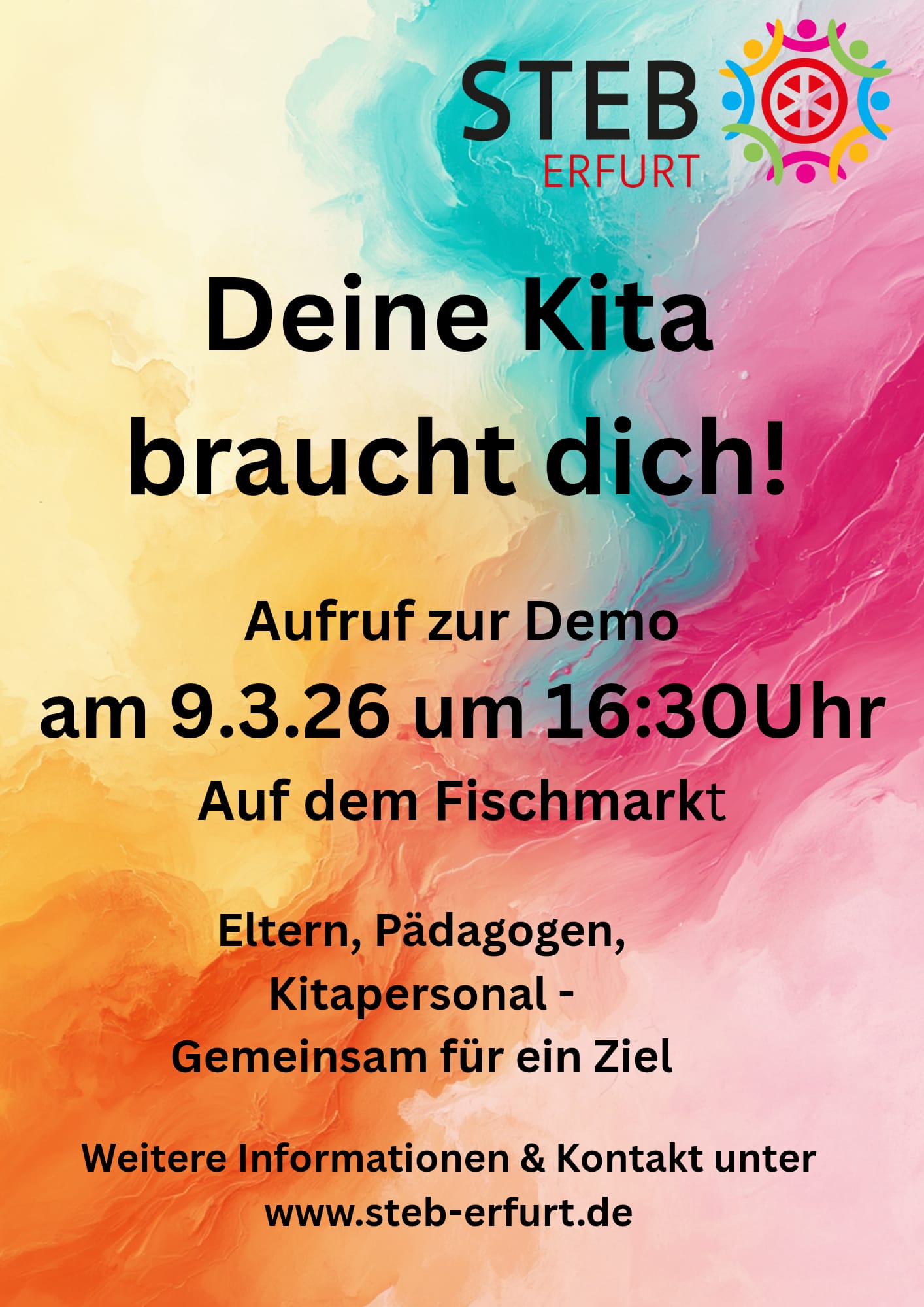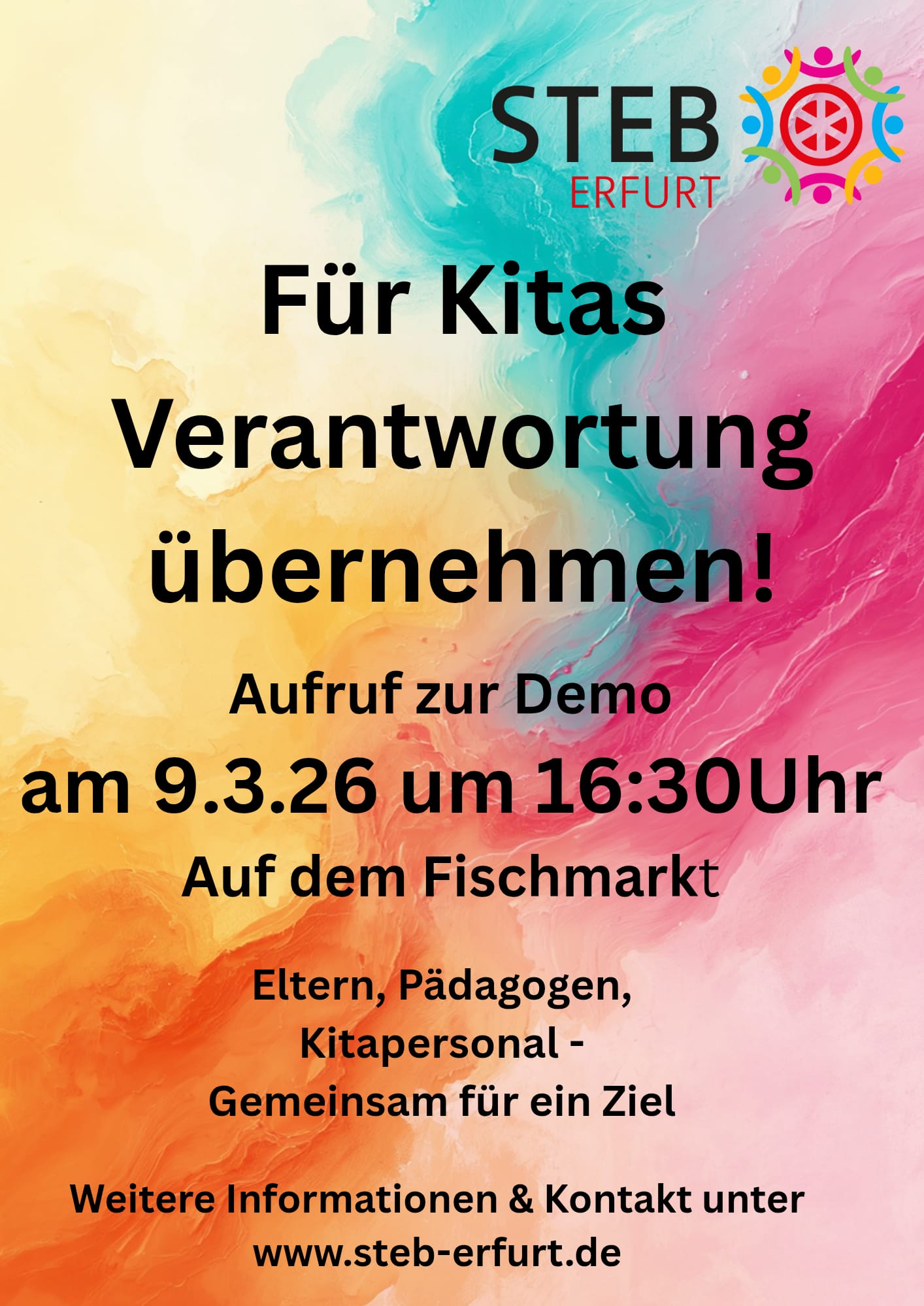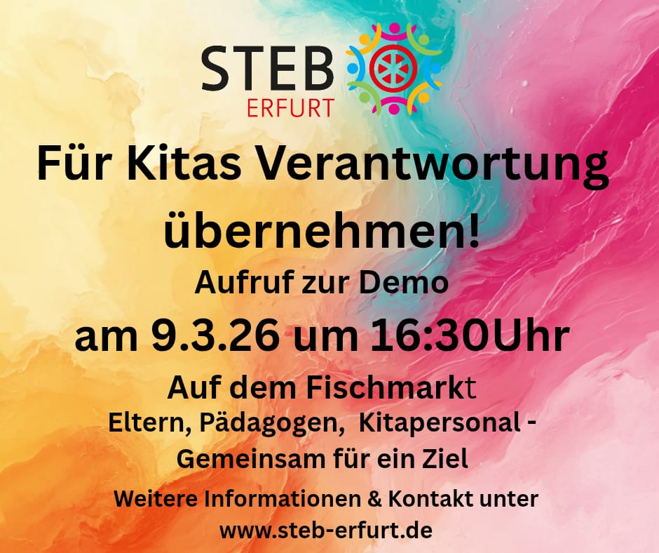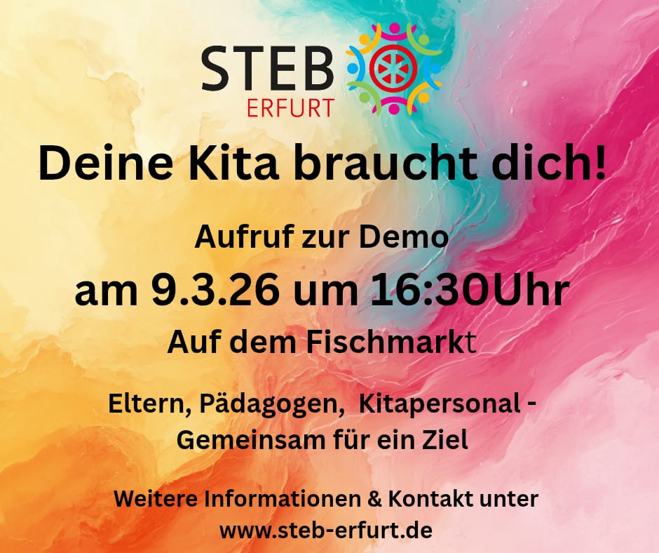 Der Stadtelternbeirat Erfurt (STEB) ruft alle Eltern, Familien und Unterstützer:innen dazu auf, am 09. März 2026 gemeinsam auf die Straße zu gehen. Wir wollen ein starkes, unüberhörbares Zeichen setzen: Erfurt braucht das Moratorium – jetzt.